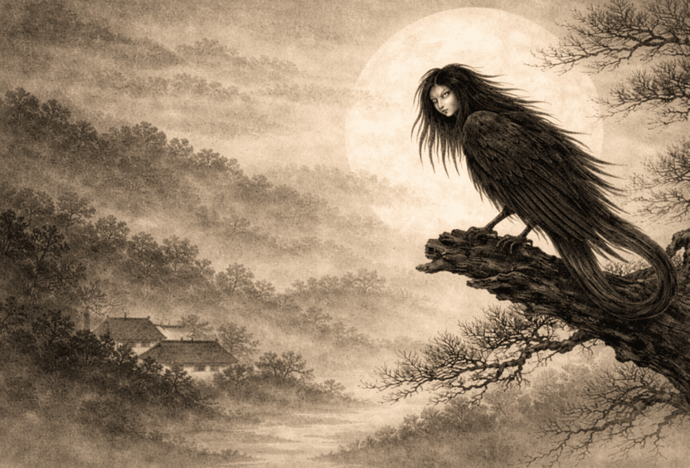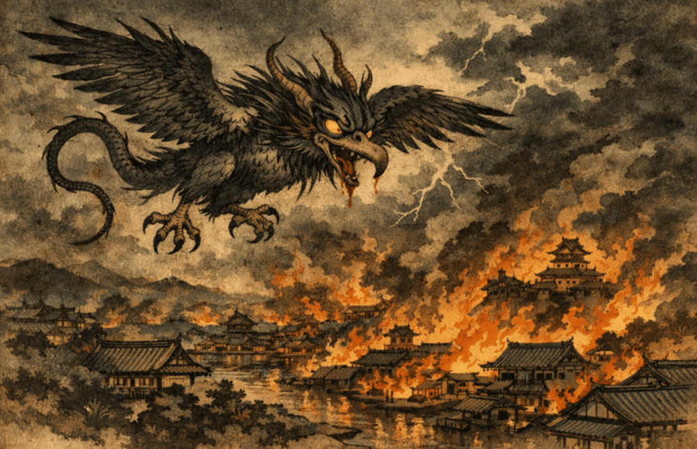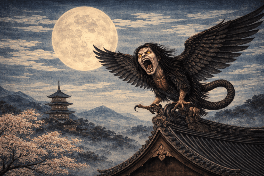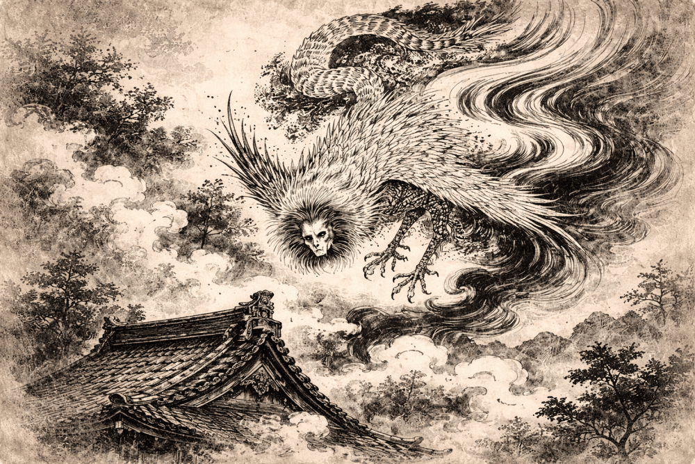The itsumade is a large Japanese mythological bird that is believed to roam the night sky during troubled times screeching and crying out with unnerving sounds.